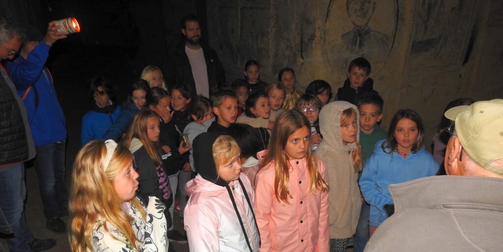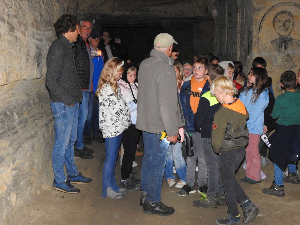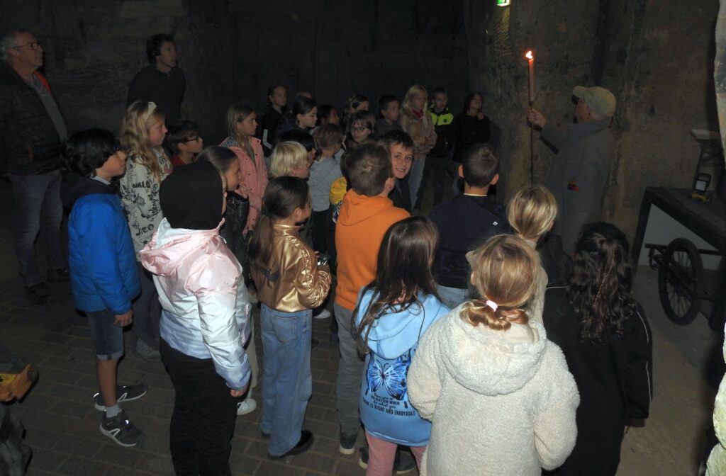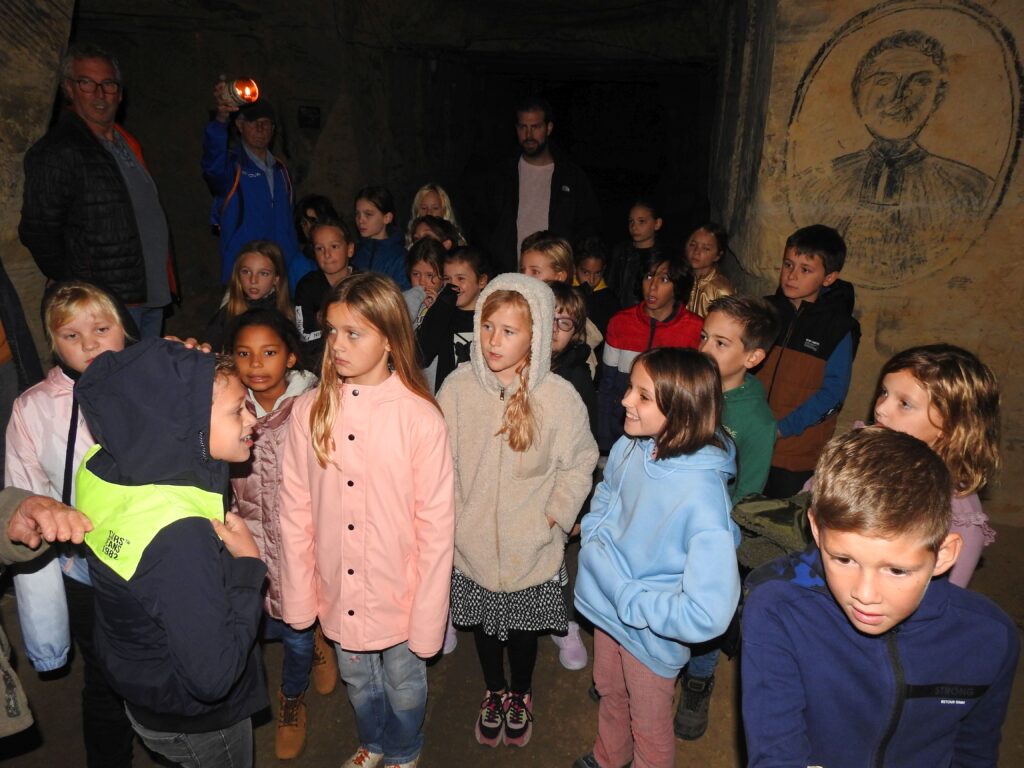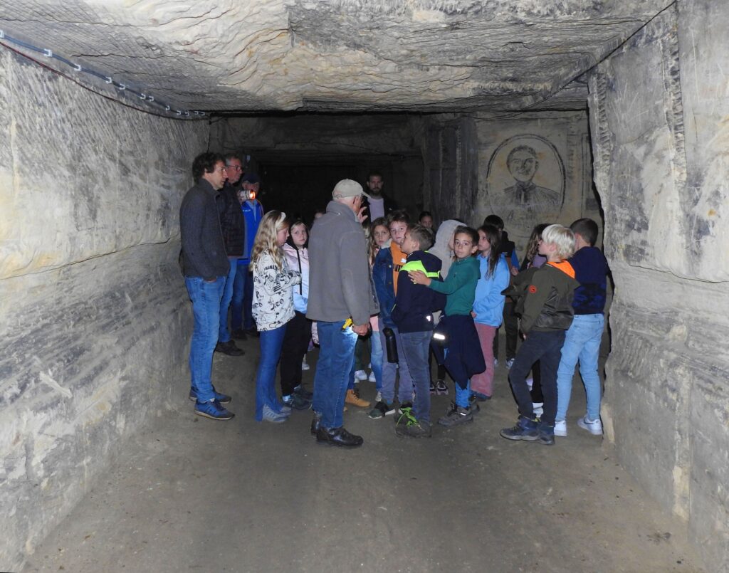 Gaande de wandeling, georganiseerd door Indertied in nauwe samenwerking met stichting ‘De Rotswoning’ (www.rotswoning.nl) en spreker Franske, werden de 120 miljoen jaren opeens 125 miljoen jaar, maar het zijn kniesoren die op een jaartje meer of minder letten, zeker wanneer 4 volle big bags met weggegooide reclamefolders plotseling 5 volle big bags worden. Weggegooid in een plafondse schacht die door de vrijwilligers in de groeve weer open werd geboord. Het jonge gehoor vond het prachtig en bij momenten ook spannend, héél spannend. Zeker wanneer het te volgen licht om het hoekje van een gang verdween. Jeugdige meligheid nam bij momenten de spanning weg maar feit bleef dat de groep angstvallig bijelkaar bleef. Heldenmoed vonden de stoersten zelfs overbodig. Die zag je toch niet in de duisternis was de conclusie van een der opeens niet meer zo stoeren.