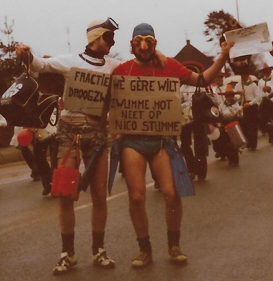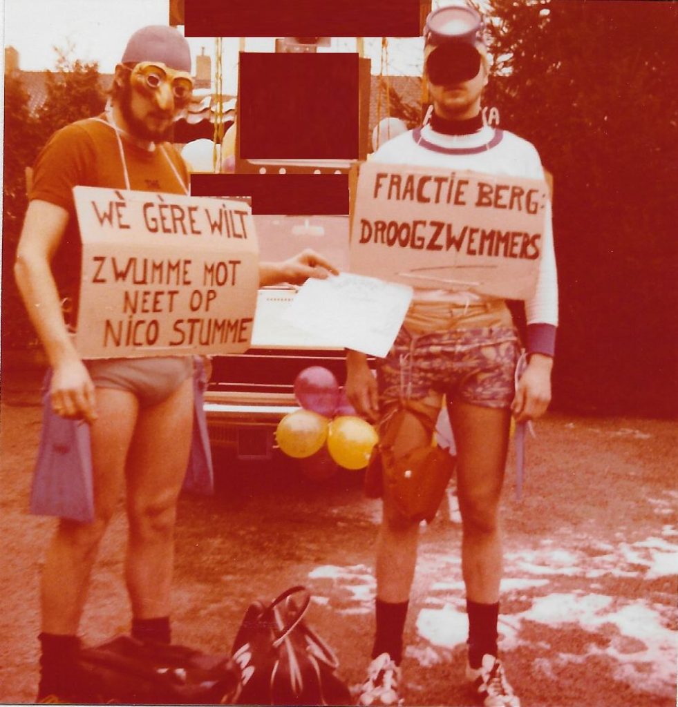 We gingen in de optocht sjampen op de toenmalige gemeenteraad. Een raad die met 8 tegen 3 stemmen het besluit had genomen om een heus zwembad te laten aanleggen in Berg. Maar de drie tegenstemmers hebben het indertied zover weten te krijgen dat die aanleg niet doorging. Dus daar gingen wij op sjampen. Met zelf ontworpen zwemdiploma’s en de slogans ‘Drie is miè es ach’ en ‘Wè gère wilt zjwumme, mót neet op Nico sjtumme”.
