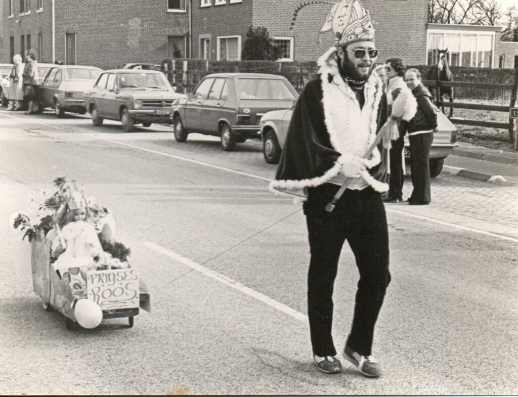 Met dank aan een mijner zussen was die al gauw gevonden. En met nog veel meer dank aan een toen aanstaande zwager werd er een prinsessenwagen opgetuigd. En mijn moeder zorgde, al bloemschikkend, voor een fleurige bloemenstruis. Alleen de chauffeur van de bloemenwagen moest nog in het juiste pak gehesen worden en dat lukte mij ook, wonderwel. Met dank aan een oud-prins, die mij belangeloos, hoewel belangeloos, het kostte mij vijf pilsjes, zijn prinsenpak ter beschikking stelde. Nog gauw een eigen ontwerpscepter en zie… de zaterdag voor de optocht waren de kersverse prinses, de wagen en ik er al klaar voor. Bijna klaar, want de prinses was verbaal niet goed onderlegd, zeg maar sprakeloos en dus moest er een cassettebandje ingesproken worden. En omdat ik geen meisjesstem vond die genegen was om het bandje in te spreken of in te roepen, kweet ik mijzelf met een, voor die gelegenheid, hoog stemmetje van die taak.