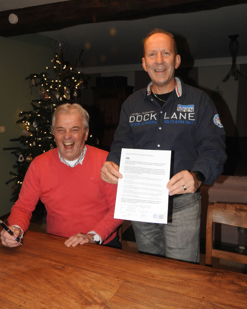 Op de foto heeft een zichtbaar geamuseerde penningmeester Bert van Kan het Manifest Netwerk Digitaal Erfgoed net ondertekend.
