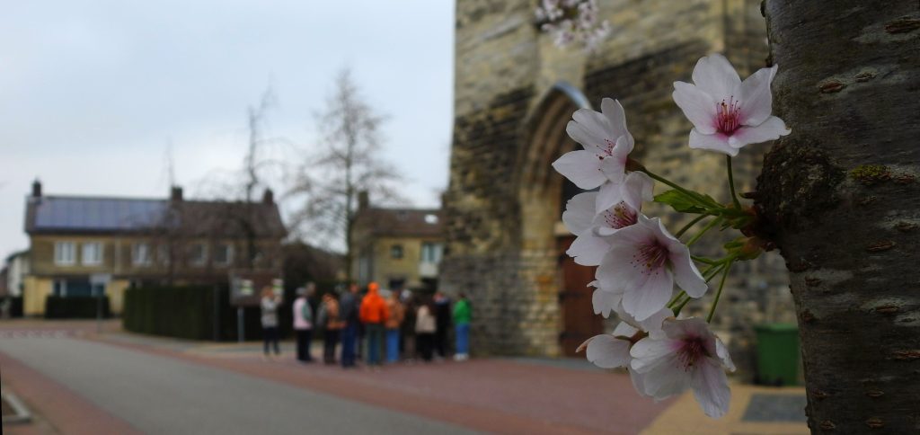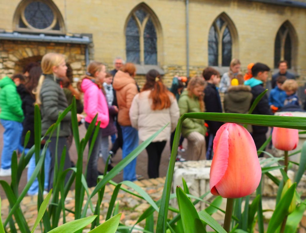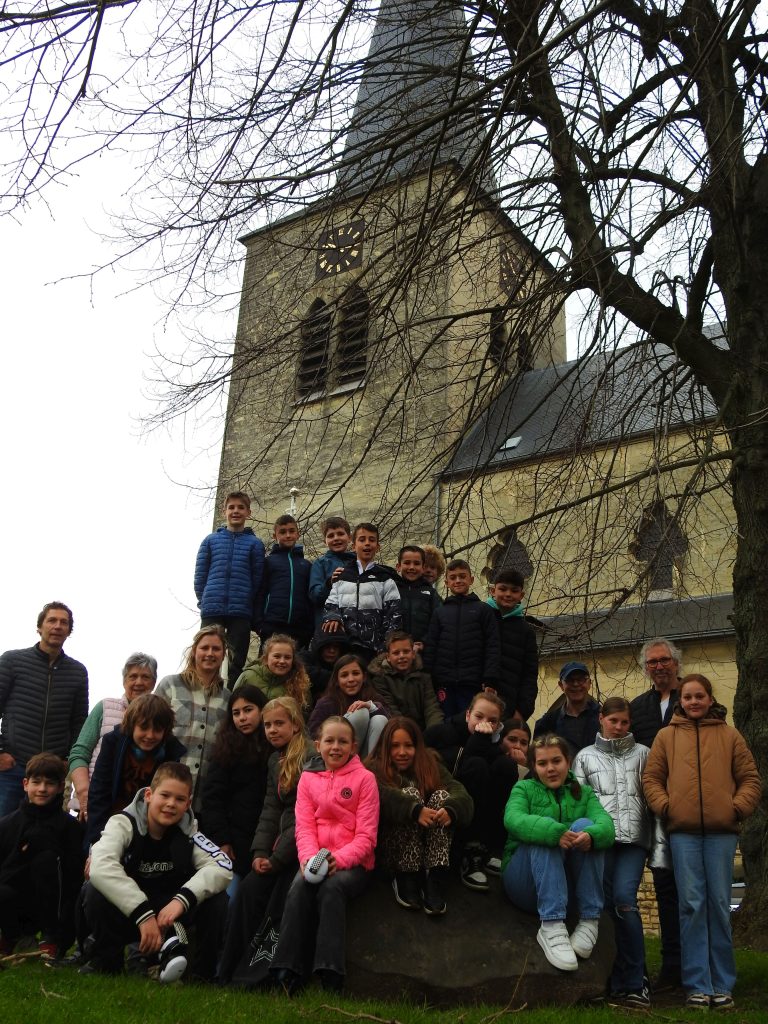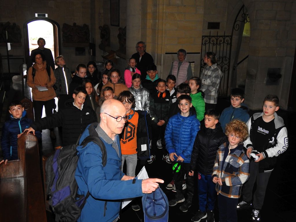 Stil wordt de groep wanneer het kerkgebouw wordt betreden. Gids Jack kwijt zich met galmende stem van zijn verbale taak in dit uit mergel opgetrokken, imposante rijksmonument. De jeugd luistert aandachtig. Voor sommige jongeren is het de eerste keer dat ze het gewelfde bouwwerk betreden en o.a. de stille vraag: “Wat is dat voor grote witte kist daar vooraan?” getuigt hiervan. Bedoelt wordt het grote, witte altaar.