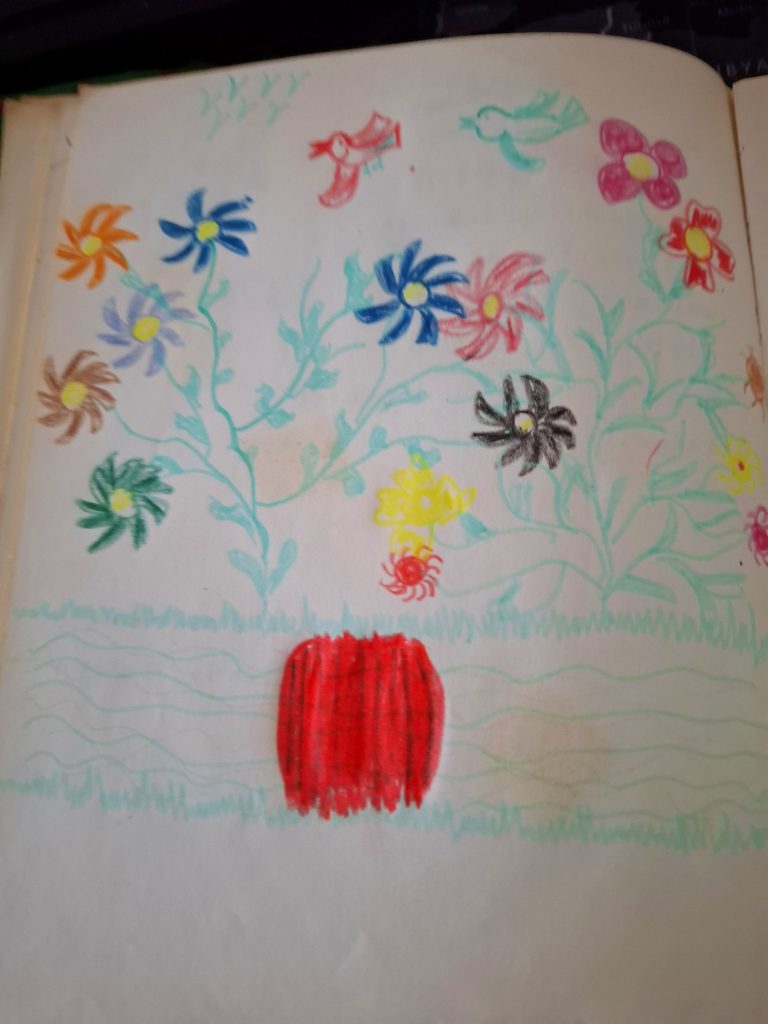 Samen met mijn vrouw driftig in de weer in de ondergrondse berging, vallen er opeens losse blaadjes uit een niet goed afgesloten doos. Gebroken witte, zeg maar vergeelde blaadjes met kinderlijk geschreven versjes en dito gekleurde tekeningen. Blaadjes uit een van de poesies van mijn vrouw, zo blijkt na bestudering van de aanhef der versjes.